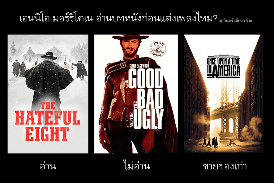 ส่วนมากมอร์ริโคเนจะอ่านบทก่อน แล้วค่อยแต่ง เช่น The Hateful Eight ของ เควนติน ทาแรนติโน