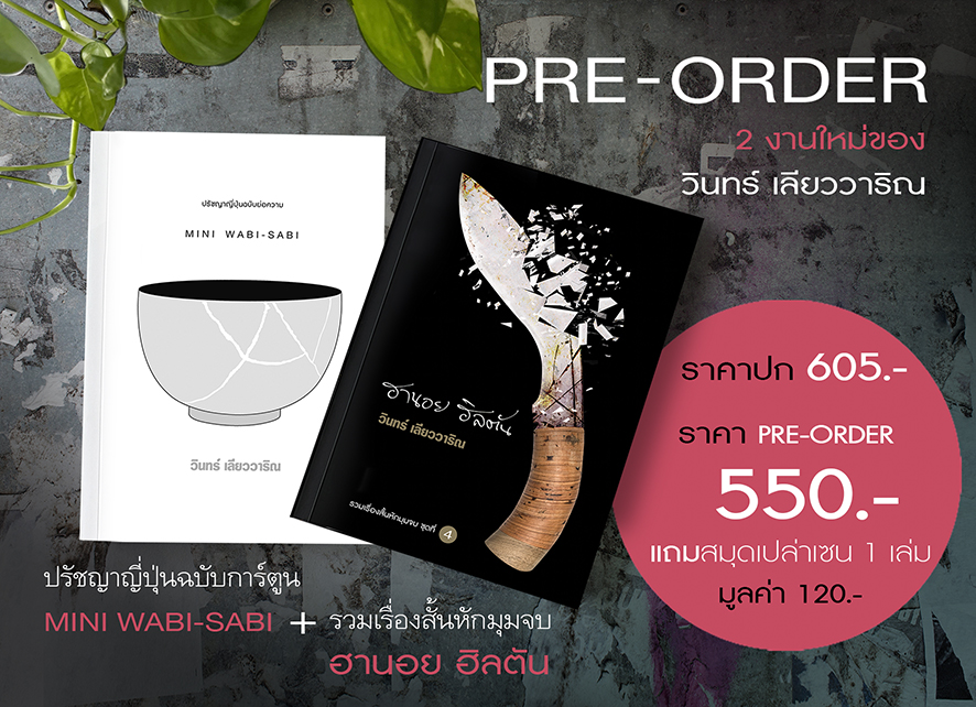 จำนวนเรื่องสั้น 22 เรื่อง ราคาปก 315 บาทpre-order พร้อมโปรโมชั่น ผ่านเว็บไซต์ วินทร์ เลียววาริณ กดลิงก์ https://www.winbookclub.com/store/detail/256/%E0%B8%AE%E0%B8%B2%E0%B8%99%E0%B8%AD%E0%B8%A2%20%E0%B8%AE%E0%B8%B4%E0%B8%A5%E0%B8%95%E0%B8%B1%E0%B8%99%20+%20Mini%20Wabi-sabi