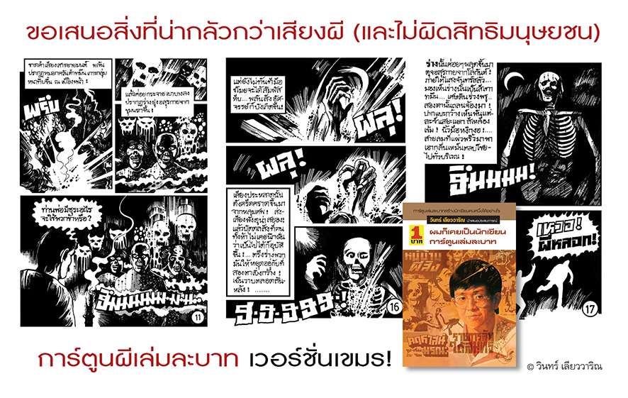 14-10-25ป.ล. ผมรวบรวมการ์ตูนผีทั้งหมดที่เคยเขียน รวมในเล่ม 'ผมก็เป็นนักเขียนการ์ตูนเล่มละบาท' ยังไม่ได้พิมพ์เป็นเล่ม แต่มีจำหน่ายในรูปอีบุ๊ค ขายที่ The Meb